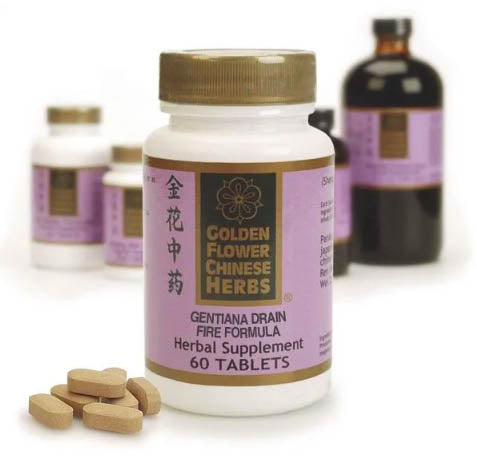 Golden Flower Chinese Herbs Gentiana Drain Fire is a classic Traditional Chinese Medicine herbal formula manufactured by Golden Flower Chinese Herbs in Albuquerque, NM. Used to clear heat and reduce inflammation, it addresses symptoms such as high fever, irritability, thirst, and red eyes. Formulated as sugar-coated tablets containing a water-decocted concentrate at a 7.5 : 1 ratio of potent botanicals, the core herbal constituents include Gentiana Root (Long Dan Cao), Scutellaria Root (Huang Qin), Gardenia Fruit (Zhi Zi), Bupleurum Root (Chai Hu), Angelica Root (Dang Gui), and Chinese Licorice Root (Gan Cao).