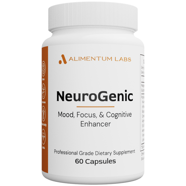 NeuroGenic (formerly NeuroSyn) is a modern nutrigenomic brain-health formula manufactured by Systemic Formulas under the Alimentum Labs line. Designed to support healthy brain aging, cognitive clarity, mood uplift, and memory recall, it protects and enhances cognitive functions through studied nootropics that modulate acetylcholine metabolism and promote balanced expression of neurological genes such as APOE, BDNF, and DRD2. Formulated as sugar-free, vegan capsules containing a precise blend of neuro-nutrients, the core active constituents include Alpha-GPC, N-Acetyl-L-Tyrosine, Phosphatidylserine, Huperzine A, Noopept, Uridine monophosphate, and botanicals such as Magnolia officinalis extract, Bacopa monnieri, Centella asiatica, Ginkgo biloba, and Vinpocetine.