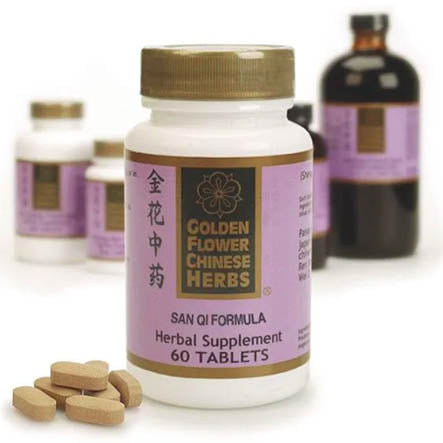 Golden Flower Chinese Herbs San Qi Formula is a traditional Chinese herbal blend manufactured by Golden Flower Chinese Herbs in Albuquerque, NM. This formula is designed to support healthy blood circulation, reduce pain, and address mild bleeding, swelling, or bruising. It is often used for trauma recovery and to manage conditions involving blood stasis or inflammation. Formulated as sugar-coated tablets containing a water-decocted concentrate at a 7.5:1 ratio of potent botanicals, the key herbal ingredients include Notoginseng Root (San Qi), Dong Quai (Dang Gui), Szechuan Lovage Root (Chuan Xiong), Chinese Peony (Bai Shao), and Chinese Licorice Root (Gan Cao).
