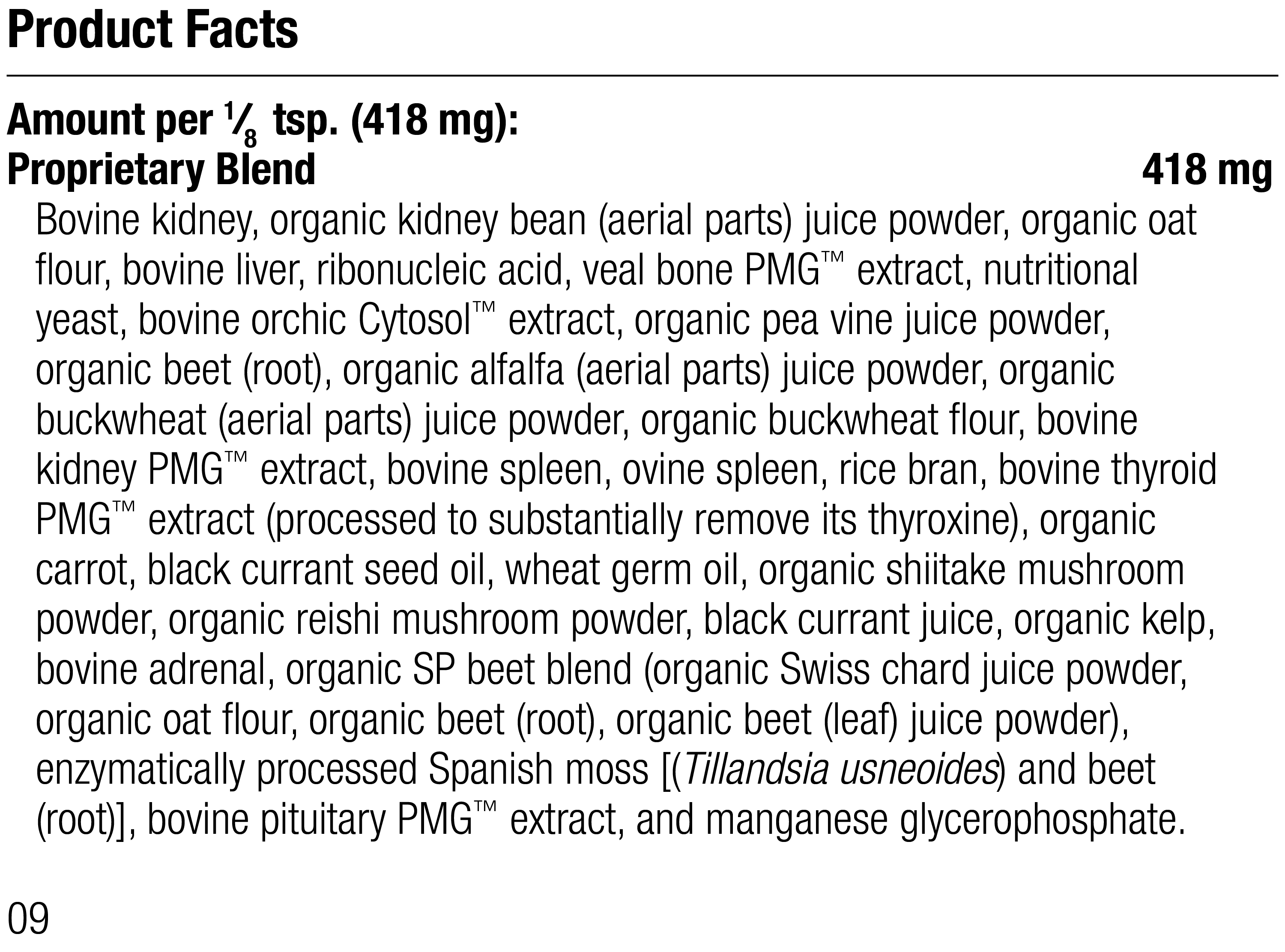 Bovine kidney, organic kidney bean (aerial parts) juice powder, organic oat flour, bovine liver, ribonucleic acid, veal bone PMG™ extract, nutritional yeast, bovine orchic Cytosol™ extract, organic pea vine juice powder, organic beet (root), organic alfalfa (aerial parts) juice powder, organic buckwheat (aerial parts) juice powder, organic buckwheat flour, bovine kidney PMG™ extract, bovine spleen, ovine spleen, rice bran, bovine thyroid PMG™ extract (processed to substantially remove its thyroxine), organic carrot, black currant seed oil, wheat germ oil, organic shiitake mushroom powder, organic reishi mushroom powder, black currant juice, organic kelp, bovine adrenal, organic SP beet blend (organic Swiss chard juice powder, organic oat flour, organic beet (root), organic beet (leaf) juice powder), enzymatically processed Spanish moss [(Tillandsia usneoides) and beet (root)], bovine pituitary PMG™ extract, and manganese glycerophosphate.